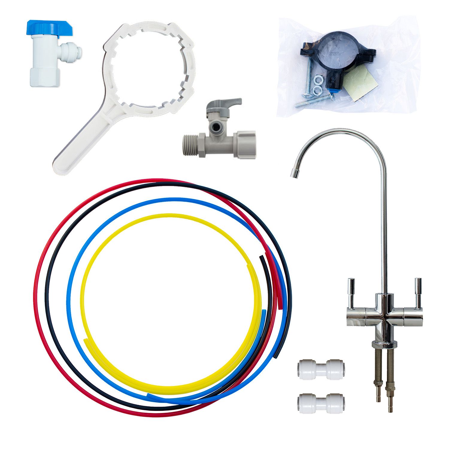 Установочный комплект включает все необходимые материалы для быстрого подключения системы к водопроводу, канализации и удобства последующей эксплуатации: